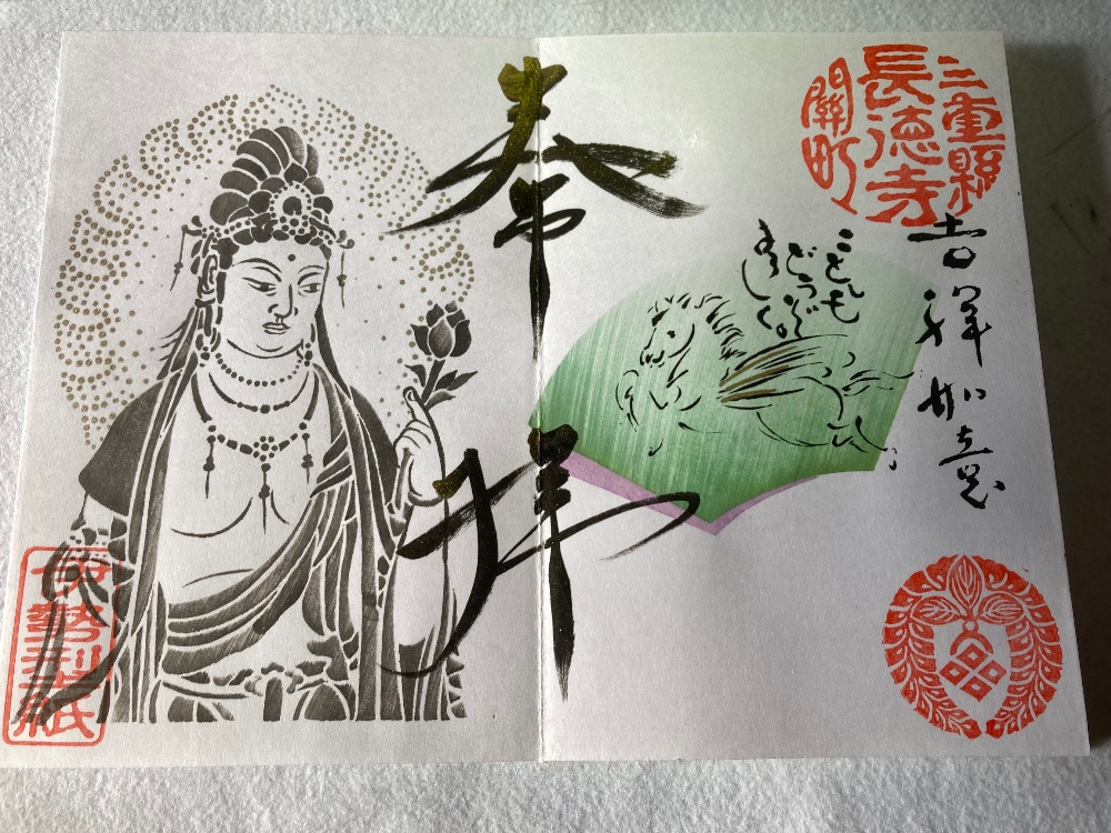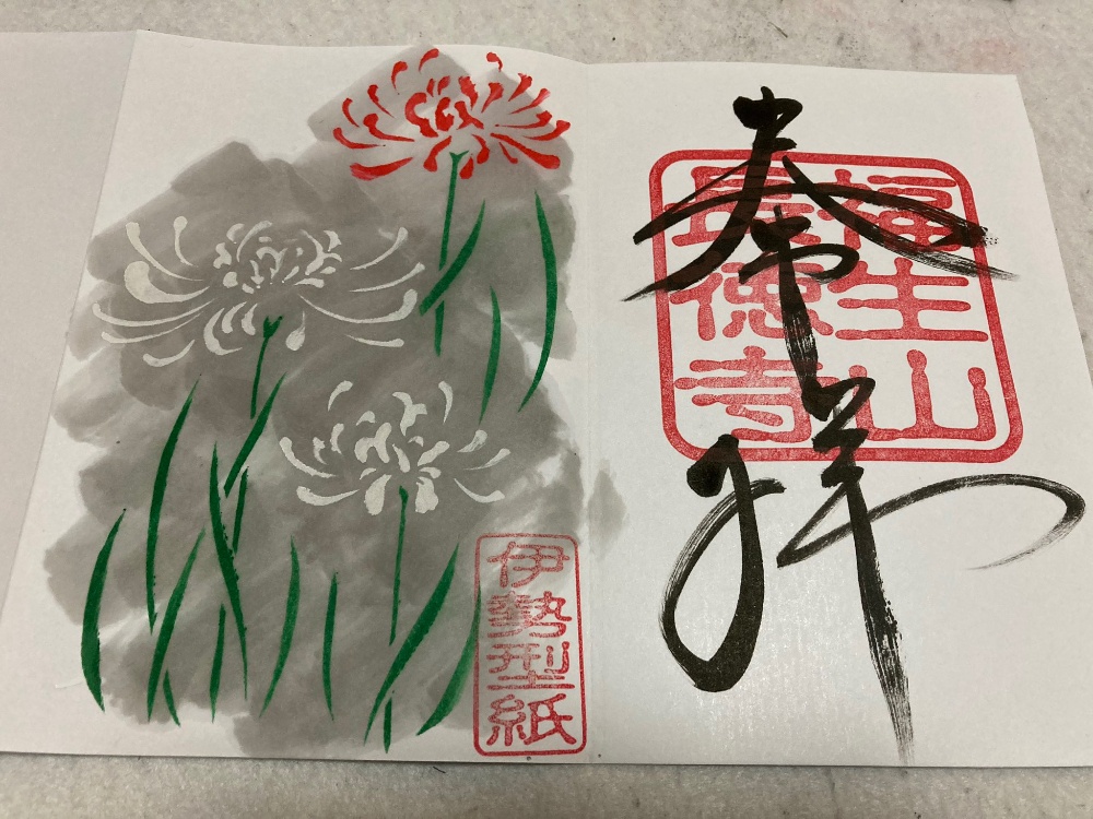 当院の御朱印は日本の伝統工芸の伊勢型紙を使用しています。何枚かの伊勢型紙を用いて一つの絵柄を完成させる技法と伊勢型紙の彫りの技法を用いて独特の柄を表現しています。